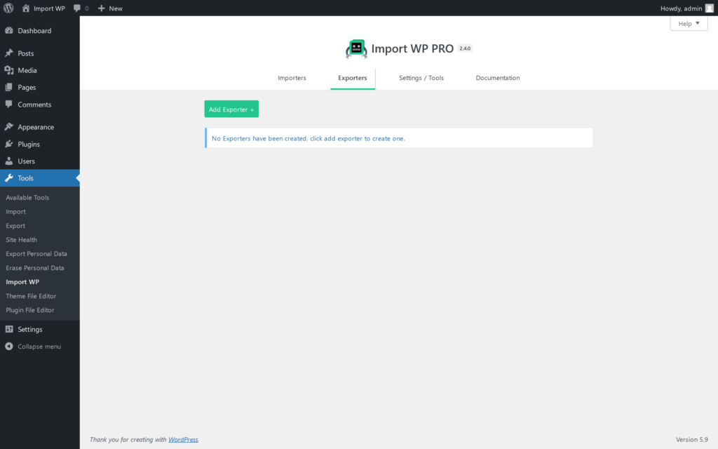 To create a new exporter, via the ImportWP screen (Accessed under Tools > Import WP), click on the Exporters tab at the top of the screen, this will load a page showing a list of all exporters.