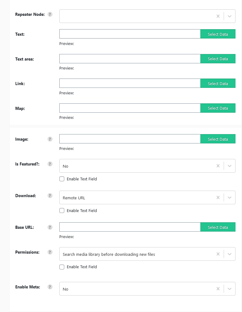 The Advanced custom fields integration adds new sections to the importer template field section per ACF Repeater or Group field. Each repeater section will allow you to import data to multiple rows.